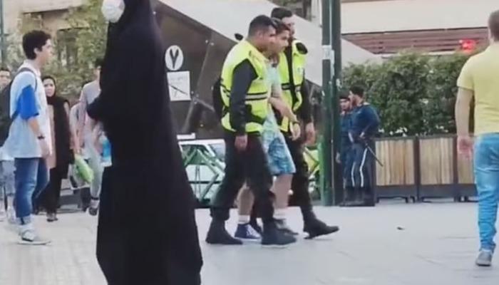 İran'ın başkenti Tahran'da 45 derecelik sıcaklıkta güvenlik güçleri, bermuda şort giyen iki kişiyi darp ederek, arkalarından kelepçeledi.
